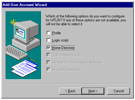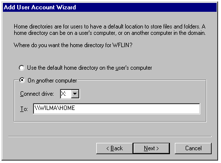 The options you specified in step 6 determine the sequence of wizard dialogs. As an example, if you selected Home Directory in step 6, the dialog shown in figure 12.25 appears. Click the On Another Computer option button, specify the user's drive letter mapping in the Connect Drive list for the user's home folder on the server, and type the UNC path to the server share for the home folder in the To text box. (You receive an error message if the share doesn't exist.) Click the Next button. If you selected more than one option in step 6, additional dialogs appear to aid you in setting up the additional options.