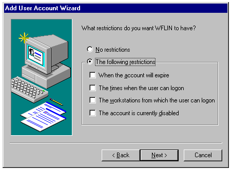 You can add restrictions to the user's account by selecting The Following Restrictions option to enable the four check boxes shown in figure 12.26. If you specify one or more restrictions, additional dialogs appear to help you define the restrictions. Click the Next button.
