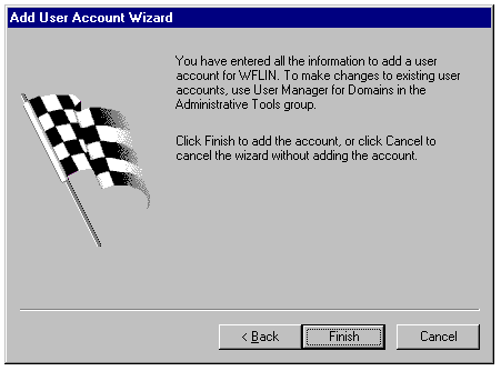 When you complete the dialogs for user restrictions (if any), the last dialog that appears indicates that the wizard is about to complete the task (see fig. 12.27). Click the Finish button to create the account.