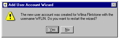 A message box (see fig. 12.28) confirms the creation of the new user account. Click No to exit the Add User Account Wizard or Yes to add another account.