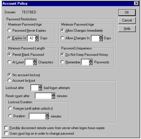 Maximum Password Age determines how long account passwords are in effect before they expire. The options are Password Never Expires or Expires In n Days (the default). Minimum Password Age determines how long a user account is forced to retain a new password. The objective is to prevent users from entering a dummy password when their password expires and then immediately changing it back to the old password. The options available are Allow Changes Immediately (the default) or Allow Changes In n Days. Minimum Password Length determines the minimum allowable length for all passwords. The options available are Permit Blank Password (the default) or At Least n Characters. To maintain a secure network, require passwords of at least six (preferably at least eight) characters. Password Uniqueness tells Windows NT Server whether to keep a history of previously used passwords. The objective is to prevent users from reusing the same password when a password expires. The available options are Do Not Keep Password History (the default) or Remember n Passwords. For maximum security, set n to 8 or greater.