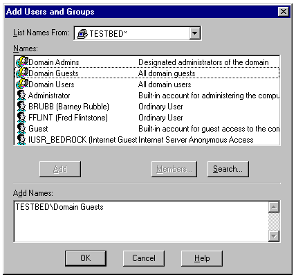 List Names From. This drop-down list lets you select the domain from which to add names or groups. The default setting is the domain for the local group. Names. This list displays all the users and global groups of the domain that's being viewed. The items in this list are candidates for inclusion in the new local group. Members. To view the members of a global group, select the global group from the Names list and click the Members button. Search. This button is used to find a domain name-a useful feature if your network contains many domains.
