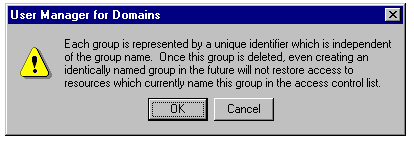 Select the group to delete from the Groups list of User Manager's window. From the User menu chooseDelete. A warning message appears (see fig. 12.34).