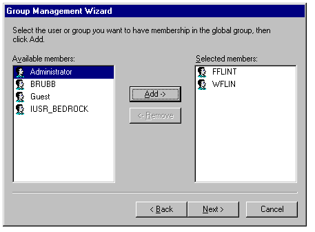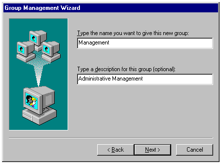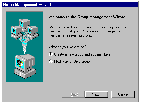 The Group Management Wizard is a tool for creating new groups and adding users to the new group. You also can use the Group Management Wizard to change the membership of or delete existing groups.