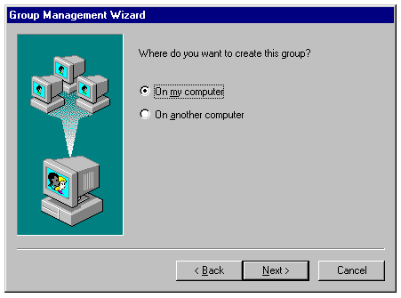 If you're working at the server on which the group is to be created, accept the default option, On My Computer (see fig. 12.37); otherwise, select On Another Computer. Click the Next button.