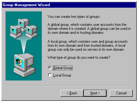 You can choose between creating a Global Group (the default) and a Local Group (see fig. 12.39). Unless you have a specific reason for creating a Local Group, accept the default and click Next.