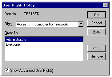 The Right drop-down list at the top of the dialog displays rights that you can assign to or remove from Windows NT Server 4.0 groups. By default, only basic rights are listed in the list. To see advanced rights, mark the Show Advanced User Rights check box at the bottom of the dialog, and then select the right you want to examine. When you select a user right from the Right drop-down list, the Grant To list changes to reflect the groups to which the right is assigned. To add new groups to the right, click the Add button to display the Add Users and Groups dialog with a list of users and groups in the domain. Select the groups and users to which you want to assign the right. To remove a user right from a group or user, select the right, select the user or group to be removed in the Grant To list, and then click the Remove button. When all your changes are complete, click OK to effect the changes and close the dialog.