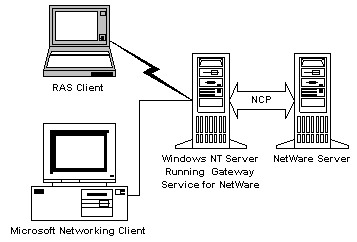 Microsoft Networking clients accessing shared resources on a Novell NetWare server with the Gateway Service for NetWare.