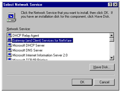 Selecting Gateway (and Client) Services for NetWare in the Select Network Service dialog.