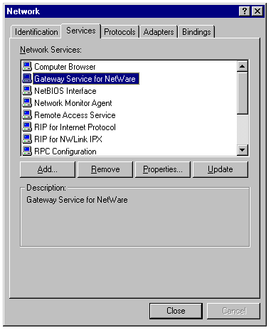 The Network property sheet displaying Gateway Service for NetWare as an installed network service.