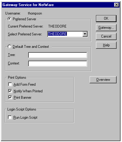 Setting the preferred server and other options in the Gateway Service for NetWare dialog.