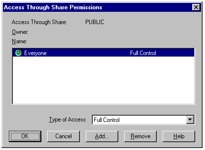 Assigning permissions for the newly created share in the Access Through Share Permissions dialog.