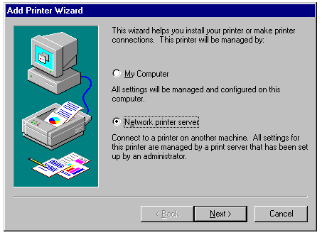 Setting up a shared network printer with the Add Printer Wizard.