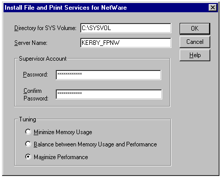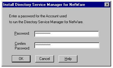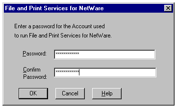 Entering the password for the account to be used to run File and Print Services for NetWare.