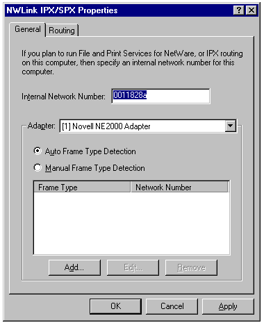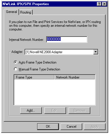 The NWLink IPX/SPX Properties sheet's General page, which allows you to specify protocol properties for each adapter.