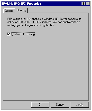 Enabling IPX/SPX RIP routing on the Routing page of the NWLink IPX/SPX Properties sheet.