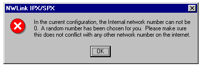 The NWLink IPX/SPX message box that warns you that the internal network number is invalid.