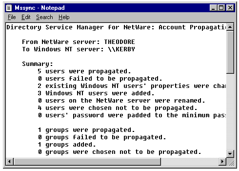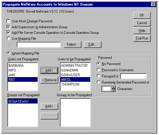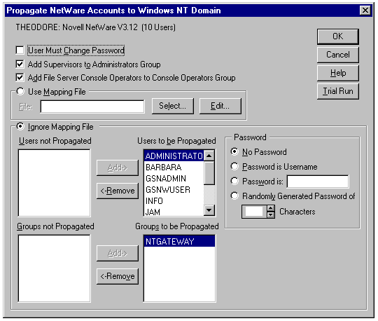 During the initial transfer of NetWare user account information, the administrator has the option of creating a Map File to re-create the NetWare accounts' passwords, assign a single password to all accounts, or set the password to the user name. The Directory Service Manager for NetWare Administrators Guide lists the necessary steps involved to import the NetWare servers user account information. The initial setup process is complicated, so Directory Service Manager for NetWare includes a Trial Run option that creates a log file containing the account information that would be migrated to the Windows NT Server.