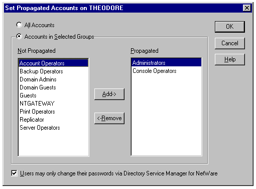 If, in addition to one or more Windows NT servers, your network includes Novell NetWare 2.x/3.x servers or NetWare 4.x servers running bindery emulation, you might consider buying Directory Service Manager for NetWare. Directory Service Manager for NetWare (see fig. 17.34) is used initially to export NetWare user account information into Windows NT Directory Services and to subsequently maintain all Windows NT Server and NetWare Server user account information in a common database.