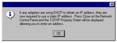 The warning that adapters now using DHCP must be assigned a static IP address before installation can proceed.