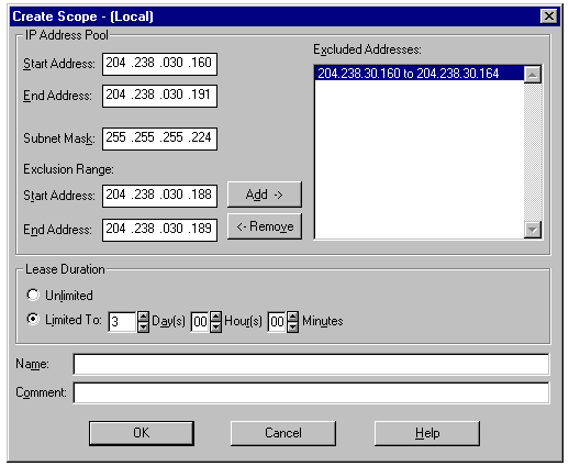 The DHCP server is assigned a block of IP addresses, referred to as a DHCP scope. For example, if InterNIC assigns your company the IP C block ranging from 207.104.167.1 to 207.104.167.255, you might choose to subnet this block using a net mask of 224 into six subnets, each supporting 30 hosts. You might then assign the subnet containing the IP addresses 207.104.167.33 through 207.104.167.62 as your DHCP scope, keeping the other subnet addresses for other uses. These 30 available IP addresses can then be assigned to DHCP clients automatically as needed. In addition to the pooled addresses assigned on a first-come, first-served basis to DHCP clients, the DHCP server can reserve specific IP addresses for use by servers and other systems for which a static IP address is necessary or desirable.