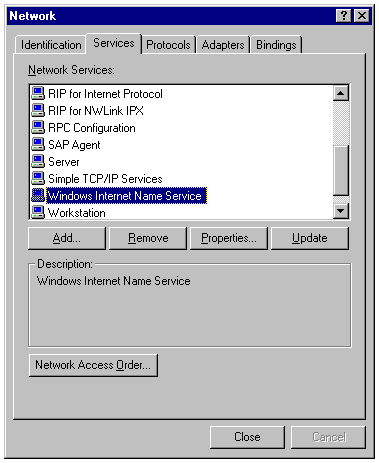 The Services page of the Network property sheet, showing Windows Internet Name Service installed.