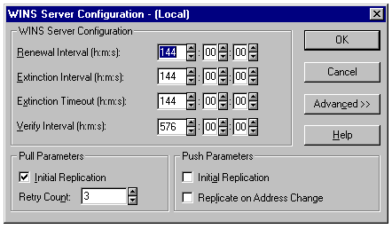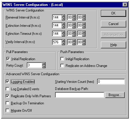 The advanced options of the WINS Server Configuration dialog.