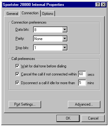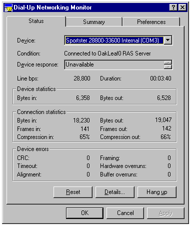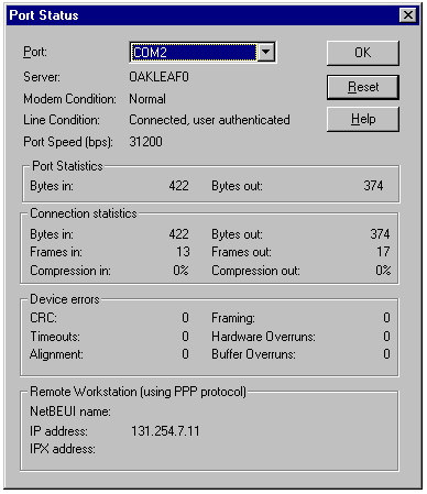The Port Status dialog is similar to the Status page of the Dial-Up Networking