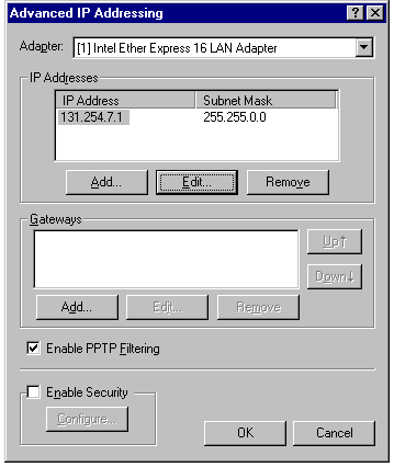 Enable PPTP Filtering check box on the Advanced IP Addressing dialog (see
