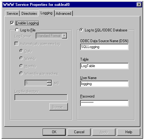 Changing logging to a SQL Server ODBC system data source on the Logging page of the property sheet for a service.
