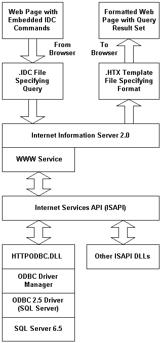 The IDC uses the Internet Services API (ISAPI) and an ISAPI DLL, Httpodbc.dll, to make the connection between Web pages and ODBC data sources in order to create Web pages based on parameterized (user-defined) queries. Query parameter(s), which determine the content of the resulting Web page, originate in a Web page that includes text boxes or lists for entering query constraints. A Filename.idc file contains the query's SQL statement and parameters to access the ODBC data source. A Filename.htx file provides the template into which the query result is inserted. Figure 20.25 shows the relationship between the components of the IDC.