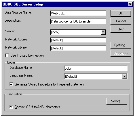 Before you can run the three IDC examples, you must create an ODBC system data source with the data source name Web SQL, and specify pubs as the default database. (Creating an ODBC data source is the subject of the section "Setting Up ODBC System Data Sources" near the beginning of this chapter.) Figure 20.26 shows the ODBC SQL Server Setup dialog for the Web SQL data source. You must be logged on to SQL server with the default sa (system administrator) account with no password for the example to work correctly.