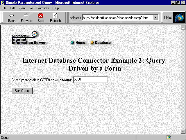 The following sections are based on the three IDC-based examples supplied with IIS 2.0, which query the pubs database supplied with SQL Server. You must have SQL Server 6.x installed to try these examples, which are located in the \InetPub\wwwroot\samples\dbsamp folder.