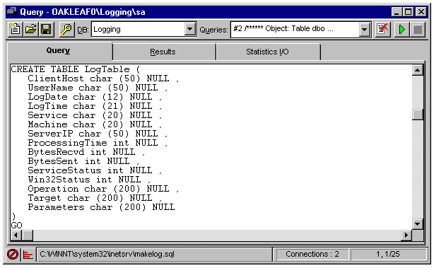 The logtemp.sql query that IIS 2.0 setup installs in \WINNT\system32\inetsrv is a simplified version of the query of listing 20.1. The logtemp.sql query creates a table named inetlog with the varchar, rather than fixed-width char, data type for text columns. Fixed-width fields provide better performance than variable-width fields at the expense of table size.