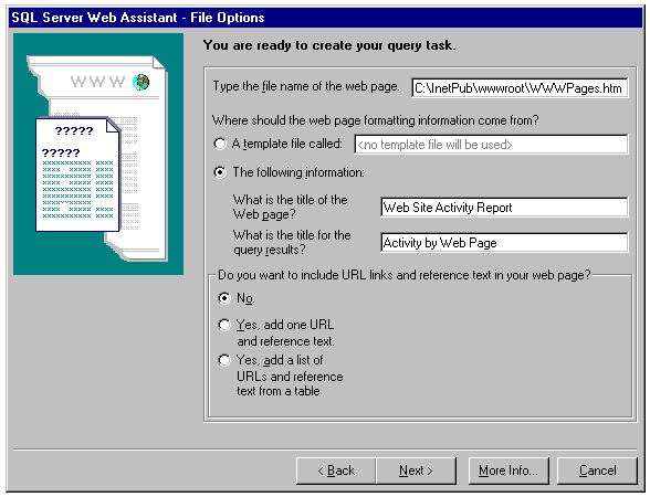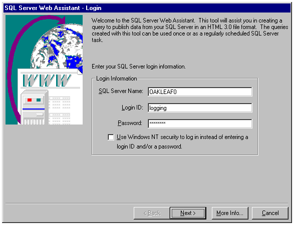 If you want to distribute usage information for your site, SQL Server 6.5's Web Assistant automates the process. The SQL Web Assistant automatically creates formatted Web pages that contain query result sets formatted as tables. A single page can display the result set from one or more queries. You also can specify the frequency at which the page is updated by a SQL Server 6.5 scheduled task. If you use a scheduled task, you can add a DELETE query after the SELECT queries to maintain records only for a specified period in the logging table. You must have system administrator privileges to use the Web Assistant.