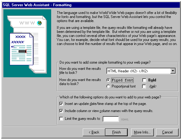 The following steps use the SQL Server Web Assistant to create a Web page, WWWPages.htm, that displays the result of the last query in listing 20.2: