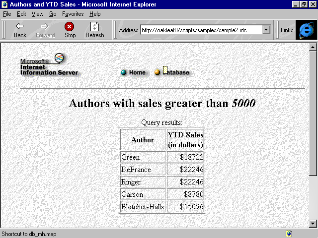 Sample.htx is a standard HTML document. The formatting is Spartan, and most of the HTML tags should be familiar to those of you who have experience with HTML tables. The %au_lname% and %ytd_sales% parameters in the <TR><TD><%au_lname%></TD><TD align="right">$<%ytd_sales%></TD></TR> line specify the field names of the pubs.dbo.titleview view that populate the table columns.