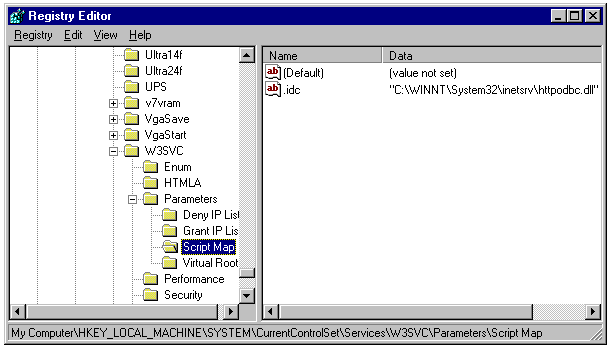 Windows NT 4.0's Registry Editor displaying the associated DLL for .IDC files, Httpodbc.dll.