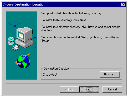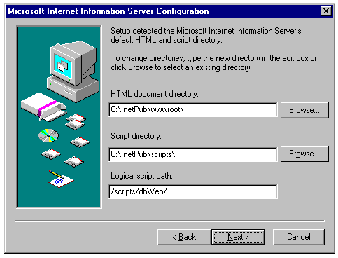 Specifying the directory locations for dbWeb 1.1, with the version of Internet Information Server 2.0 included with Windows NT Server 4.0.