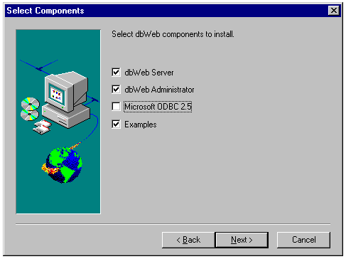 Selecting for installation all the components of dbWeb 1.1 except the ODBC 2.5 components.