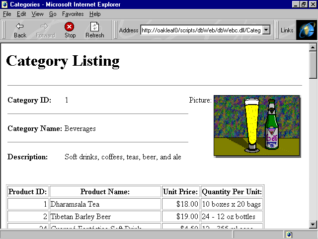 You access the dbWeb sample pages from a networked browser with the URL http://servername/dbweb/dbwtest.htm. Scroll down to the links to Pubs Examples and Northwind Examples to try the examples (see fig. 20.35). Figure 20.36 shows the page for the Northwind Category_Products data source displaying the first of four Categories table records and part of the Products table for the Beverages category. The Products list corresponds to an Access subform. The Category Listing page is static; no user-entered criteria is accepted.