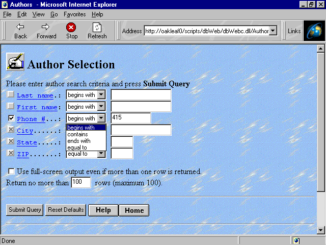 Figure 20.37 illustrates a more complex, dynamic query page for the pubs database. You enter query constraints in text boxes with modifiers chosen from standard drop-down lists. Figure 20.38 shows the result of the query of figure 20.37. (The pubs database hasn't been updated for the 510 area code of the San Francisco East Bay region.) If you click a City link, a list of all authors in the same city appear, illustrating the drill-down capabilities of dbWeb pages.