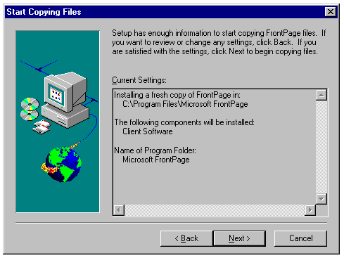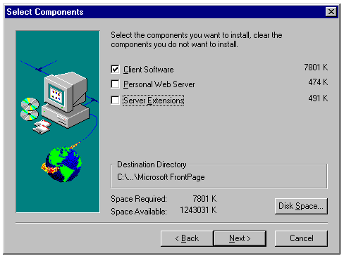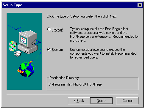 Choosing between Typical and Custom installation options for FrontPage 1.1.