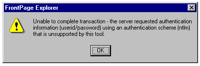 The message indicating that you haven't enabled the Basic (Clear Text) authentication required by FrontPage 1.1.