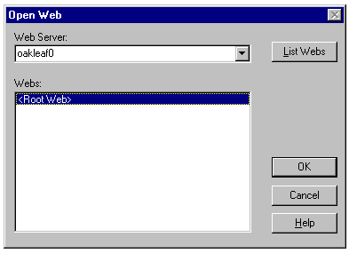 Displaying existing FrontPage Webs in the Open Web dialog.