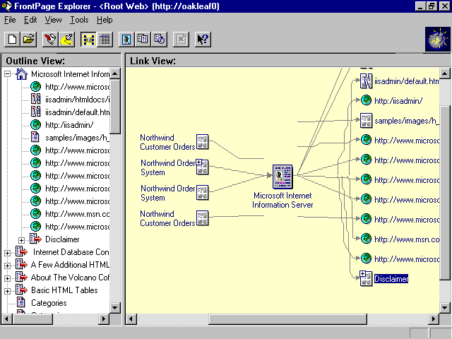 The organization of Web sites and the generation of Web content is beyond the scope of this book, but you can gain an idea of the capabilities of the FrontPage Explorer by using it to map the .HTM files supplied with IIS 2.0 and those added by any other Web applications you've installed, such as dbWeb. FrontPage automatically organizes your Web pages into a hierarchy based on their contained hyperlinks to other pages at your site, as well links to other sites. The FrontPage Editor lets you edit existing Web pages and create new pages in a graphical context.