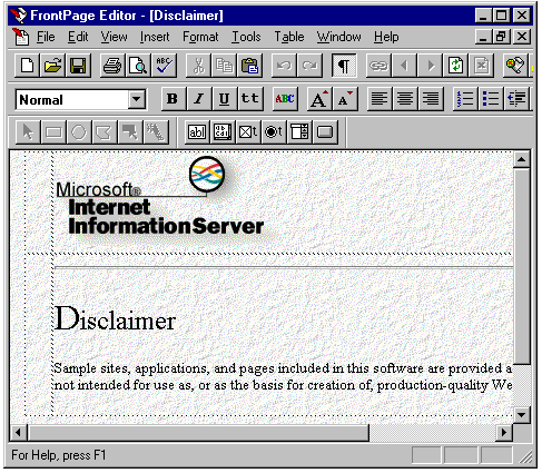 Windows NT Server 4.0 includes a copy of Microsoft FrontPage 1.1 for IIS 2.0 with a single client license. Like dbWeb, FrontPage 1.1 has two components: a server-side FrontPage Explorer for maintaining the organization of your Web pages, and a client-side WYSIWYG Web page editor for creating HTML files. FrontPage's ease of use makes it a logical tool to create the initial set of custom pages for your Web site.