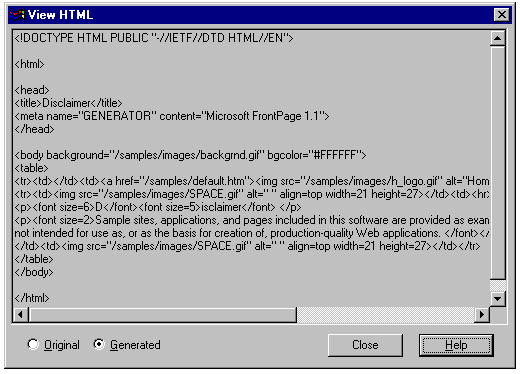 FrontPage Editor displaying a Web page from the IIS 2.0 sample site.