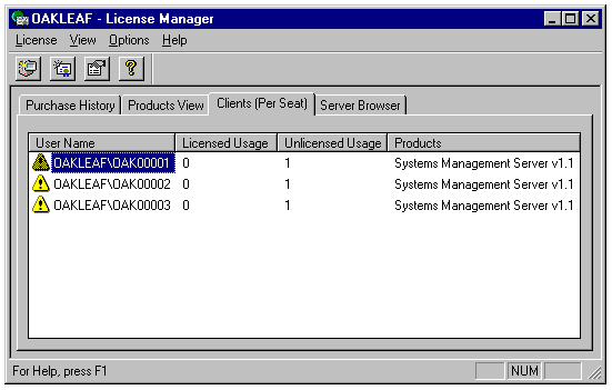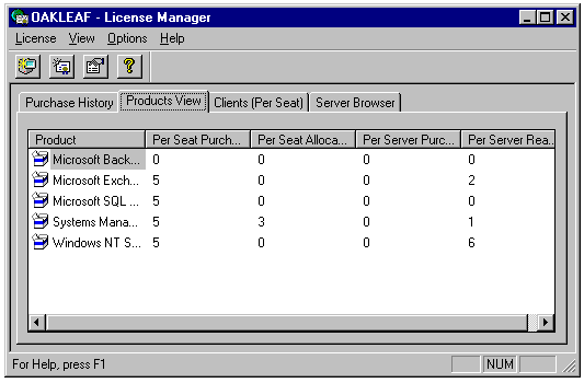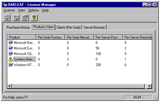 License Manager is Microsoft's aid to keeping you honest in the licensing department. Unlike some other network operating system and server application suppliers, Microsoft trusts its customers to purchase the required number of server Client Access Licenses for their organizations. License Manager lets you set the number of Client Access Licenses for BackOffice components operating in per-seat, not per-server, mode. Also, you can monitor and administer per-seat and per-server licenses for any server in the domain or in a trusting domain.