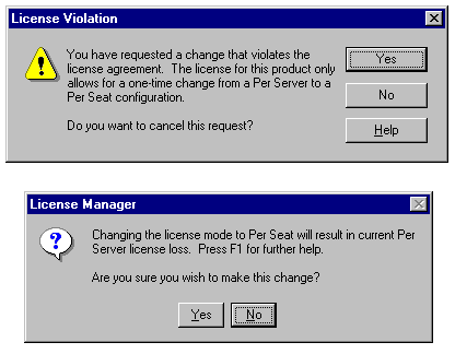 The License Violation message that appears after selecting per-seat licensing doesn't conform to Microsoft's stated policy that you can change from per-server to per-seat licensing without violating your license.